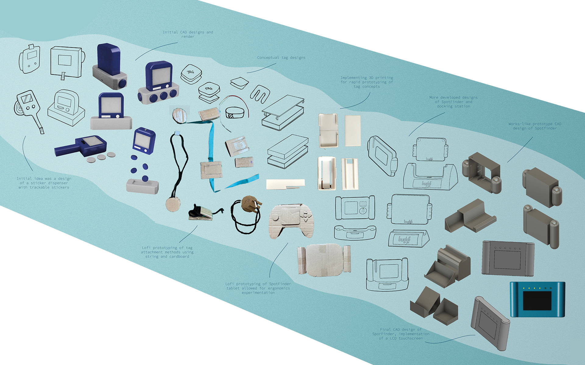 The preliminary design includes a tracking tablet, a stand that doubles as storage for the tags, and attachable tags.