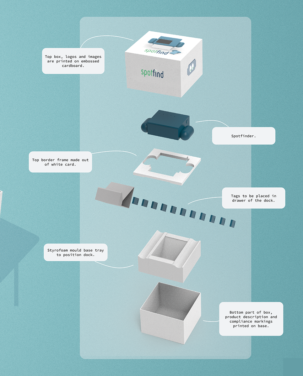 Packaging was designed to be appealing when on a shelf, clearly displaying the product as well as indicating its use. The structure highlights the SpotFinder device as the focal point from the moment of unboxing. A cardboard outer box with printed and embossed branding was chosen while internal moulded trays securely positioned the dock, tags, and components to reduce confusion during setup. Each element has a defined place, supporting an intuitive onboarding experience.